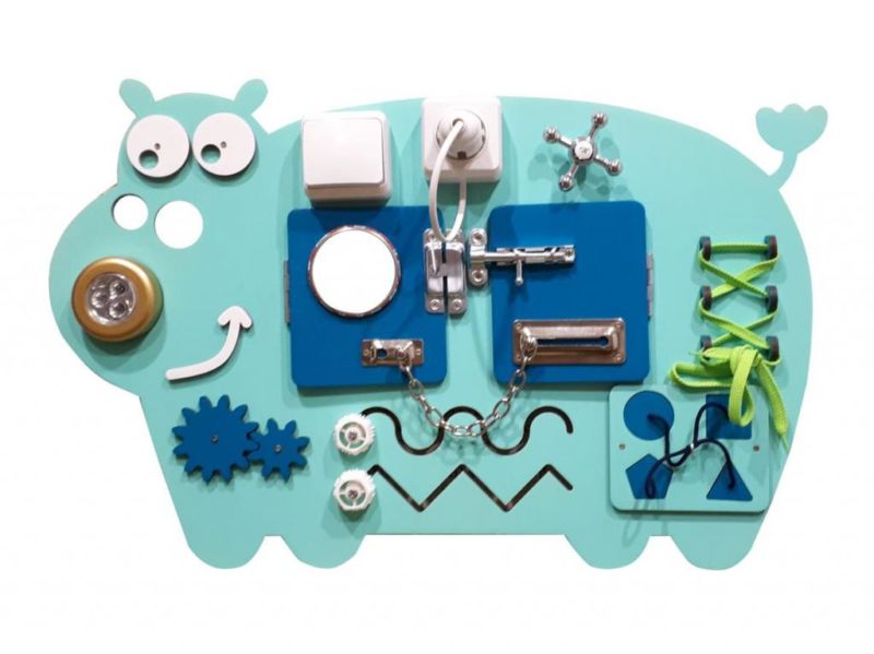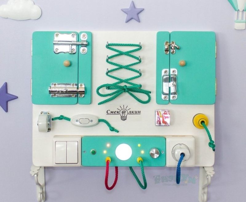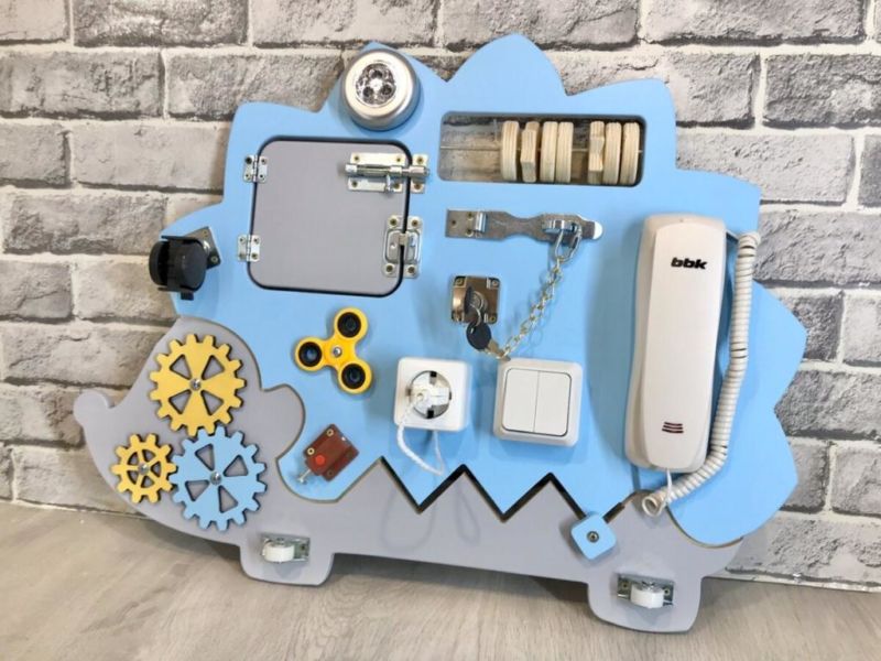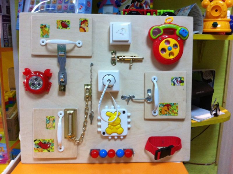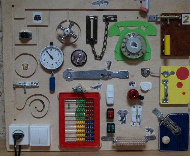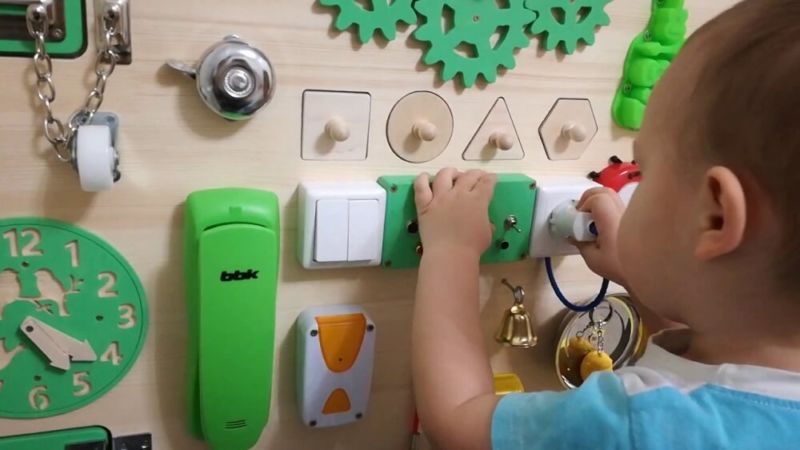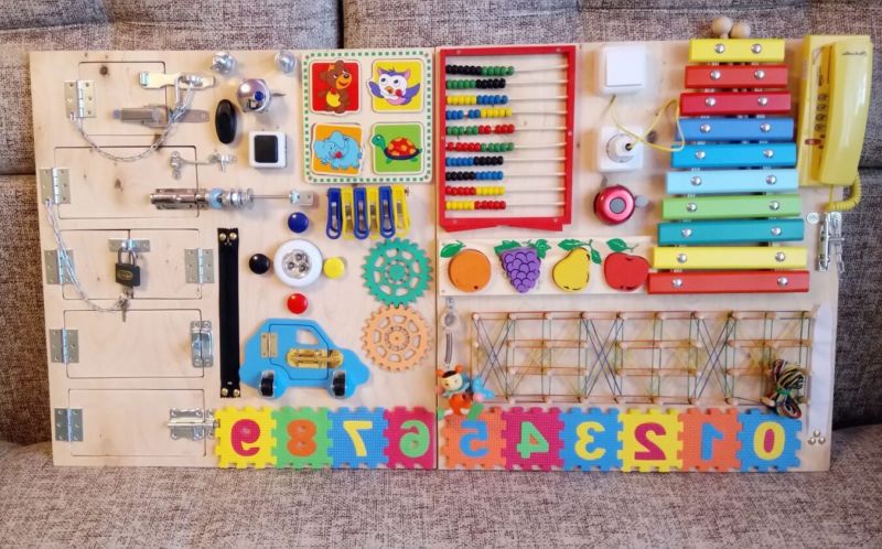 Към дъската са прикрепени ключалки, бутони, превключватели, звънци, кабели - всичко, което съпътства нормалния живот. Тези играчки ще поддържат интереса и заниманията на детето ви.