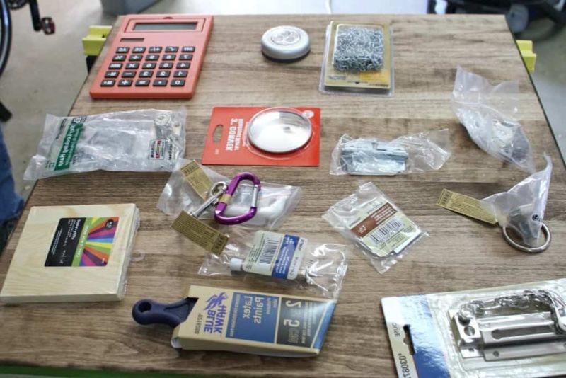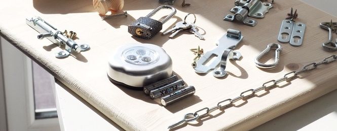 Много от хората, които се занимават с трупане на вещи, имат временно складирани предмети в килера или гаража, които могат да се използват като части за бизиборд: брави, ключалки, куки, панти за врати, крушки, ключове, контакти, електрически щепсели и др.