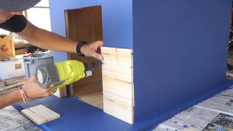 Всички дървени елементи се подравняват с помощта на нивелир и се закрепват със самонарезни винтове. В средата на стените трябва да забиете допълнителни вертикални дъски и две малки дъски отстрани на входния отвор.