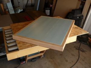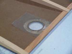 Тапицираната рамка се поставя така, че дъските да са отгоре. Вътрешността се облицова с пергаментова хартия, закрепва се с телчета с телбод, изрязва се парче стиропор с ножица според размерите и се поставя между дървените части.