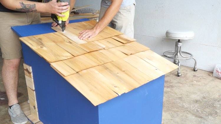 Поставете отгоре лист шперплат, като направите надвес над страничните стени от задната и предната страна. Изработените стрехи ще предпазват кошарата от дъжд. С помощта на панти за врати закрепете готовия покрив към конструкцията и поставете лист покривен филц.