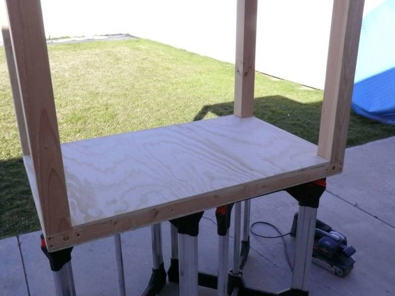 Сглобете долната рамка от четири дървени дъски с размери 5х5 см. Във всеки ъгъл монтирайте стойките, поставете дъските върху рамката. За да подсилите рамката, заковайте допълнителни летви от двете страни на дървената рамка към долната част.