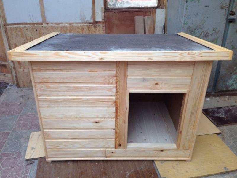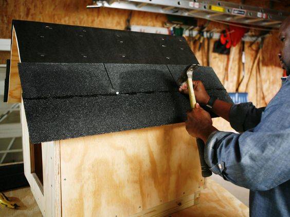Боядисайте дървения развъдник с антисептичен разтвор, след което го изсушете за два дни. Покрийте долната част на конструкцията с парче катран, като огънете разрезите на 3-5 см към повърхността на стената, закрепете върху нея две дъски с размери 10x5 см. Обърнете кучешката колиба и завършете входния отвор и краищата с планки.