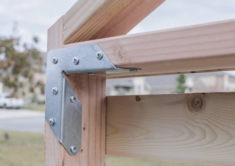 Свържете два еднакви пръта с размери 5х5 см под ъгъл 40 градуса. След това изработвате подобна заготовка. Поставете ги върху рамката, подравнете ги вертикално, на същото ниво като стените на кабината, и ги закрепете с поцинковани пирони.