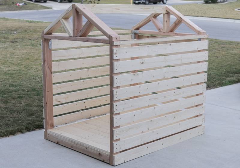 Дъска с размери 10 x 10 cm се разрязва на 4 парчета: две на разстояние, равно на височината на сградата; друга двойка е с 8 до 10 cm по-голяма. Закрепете елементите вертикално във всеки ъгъл. По-дългите крака се поставят отпред, а по-късите - отзад. Тази конструкция създава наклона на покрива.