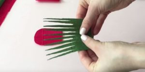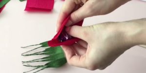 - Изрежете правоъгълници с размери 9×25 см от червена велпапе. Сгънете на 5 см широка хармоника и заоблете ъглите, за да оформите венчелистчета. След разгъването трябва да бъде празен с една основа и венчелистчета, всяко от които трябва да бъде внимателно опънато в средата.