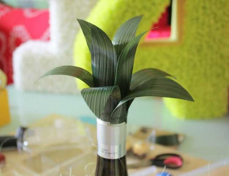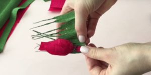 - Увийте тел в зелен материал и изрежете по 2-3 листа за всяко растение. Залепете листата под пъпката и скрепете конструкцията с телбод.