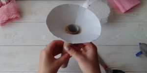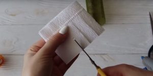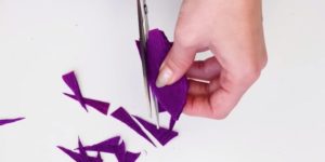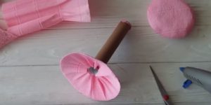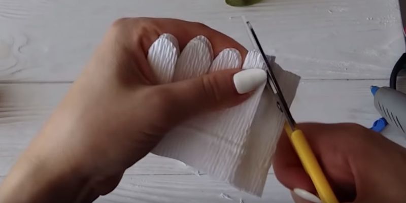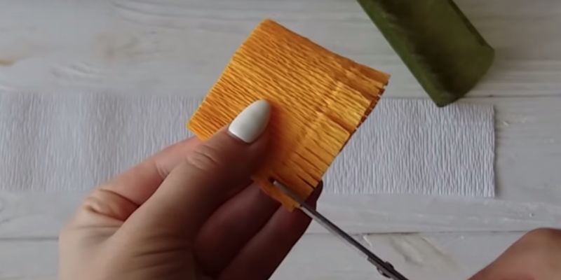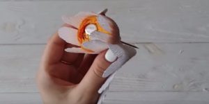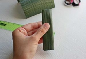 - Нарежете дълги тънки ленти от велпапе с ширина 2 см. Сгънете на две и усучете всяка от тях два пъти в средата, така че лицата да са в една и съща посока. Изпънете бъдещото венчелистче в средата. След това направете още няколко от тях.