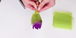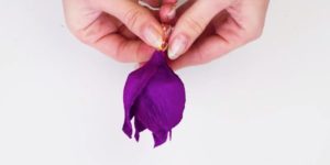 - Залепете ириса с тиксо или лента към тел, след което сгънете листенцата нагоре.