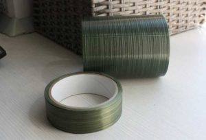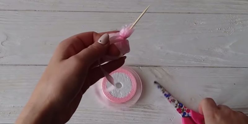 - Стебло. Увийте зелена панделка по цялата дължина на пръчката. Залепете горната и долната част с тиксо. Затегнете в средата малко парченце панделка и го усучете с ножица.