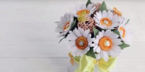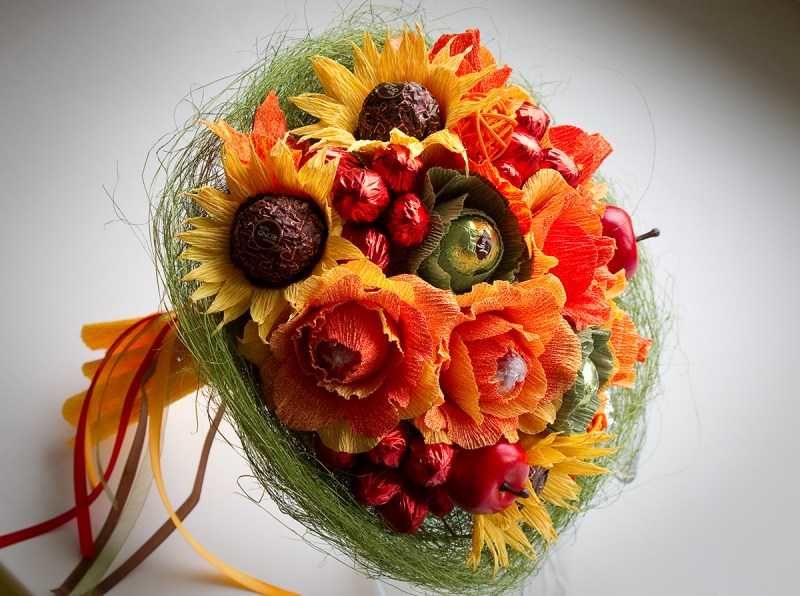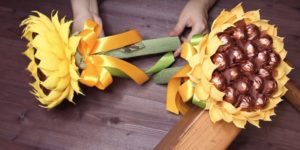 Перфектен подарък, символизиращ Слънцето, той дава надежда и вяра в най-доброто. А слънчогледът от сладкиши също е вкусен. Композицията от тези цветя може да се събере в букет или да се направи на кошница. Бонбоните "Есенен валс" са по-добри за направата им: