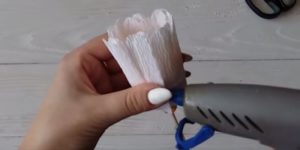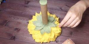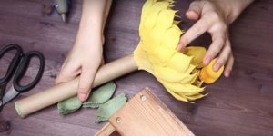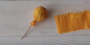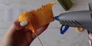 - Сглобяване на цветето. Завийте всяко парче на шиш, като го закрепите с тиксо в основата. Необходимо е частите на съцветието да се разпределят равномерно, за да не остават празнини.