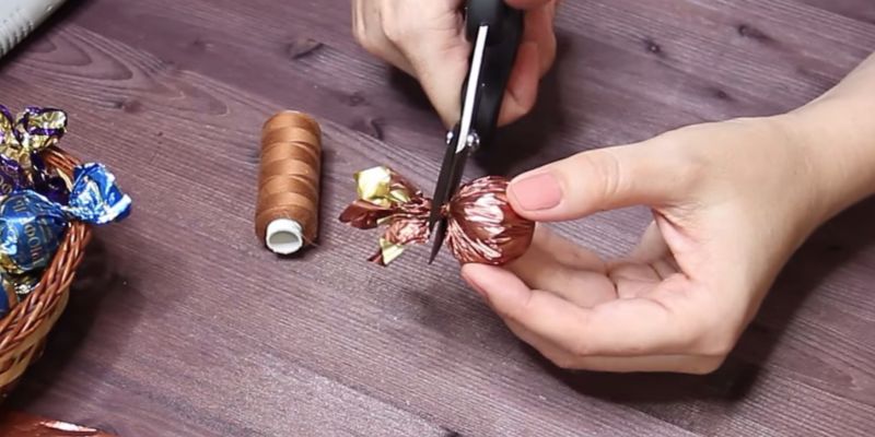 - Изрежете квадрат с размери 7×7 см от черно или кафяво велпапе, увийте бонбоните в него и го закрепете с конец.