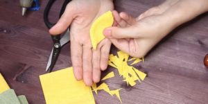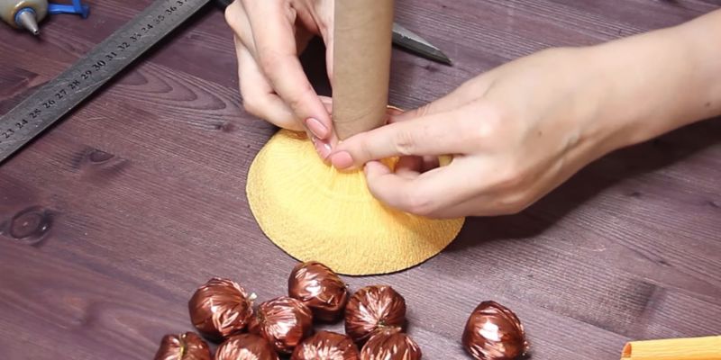 - Изрежете жълт или оранжев правоъгълник с размери 9×30 см, увийте в него бонбоните и го завържете.
