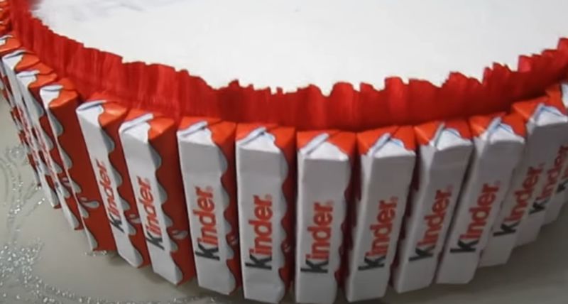 - Прикрепете всеки Kinder Surprise към шишче с лепило и го обрамчете с органза в основата.