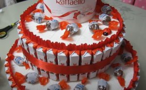 Същата цветова схема също е много приятна за използване. За изработката можете да използвате Mars, Snickers, Twix, Milky Way, Bounty и други любими лакомства.