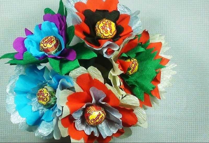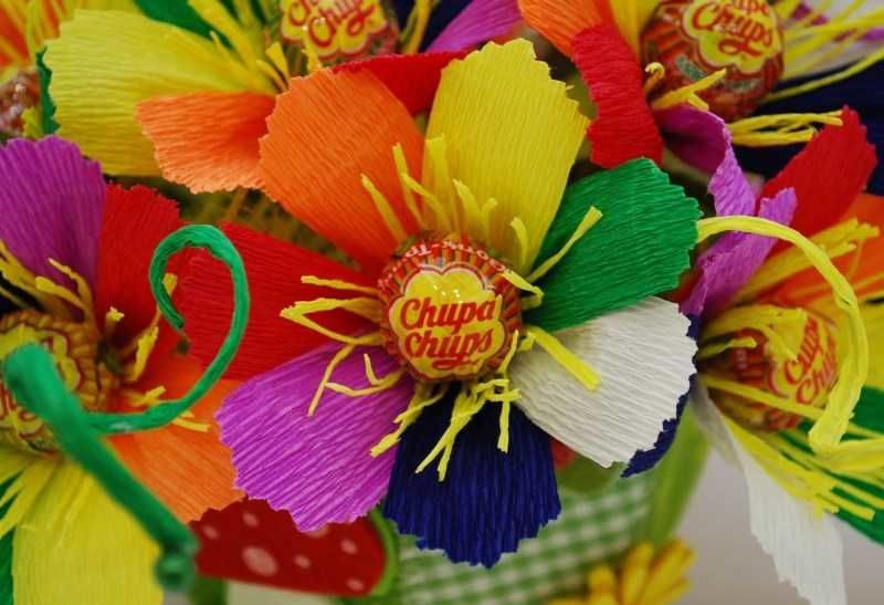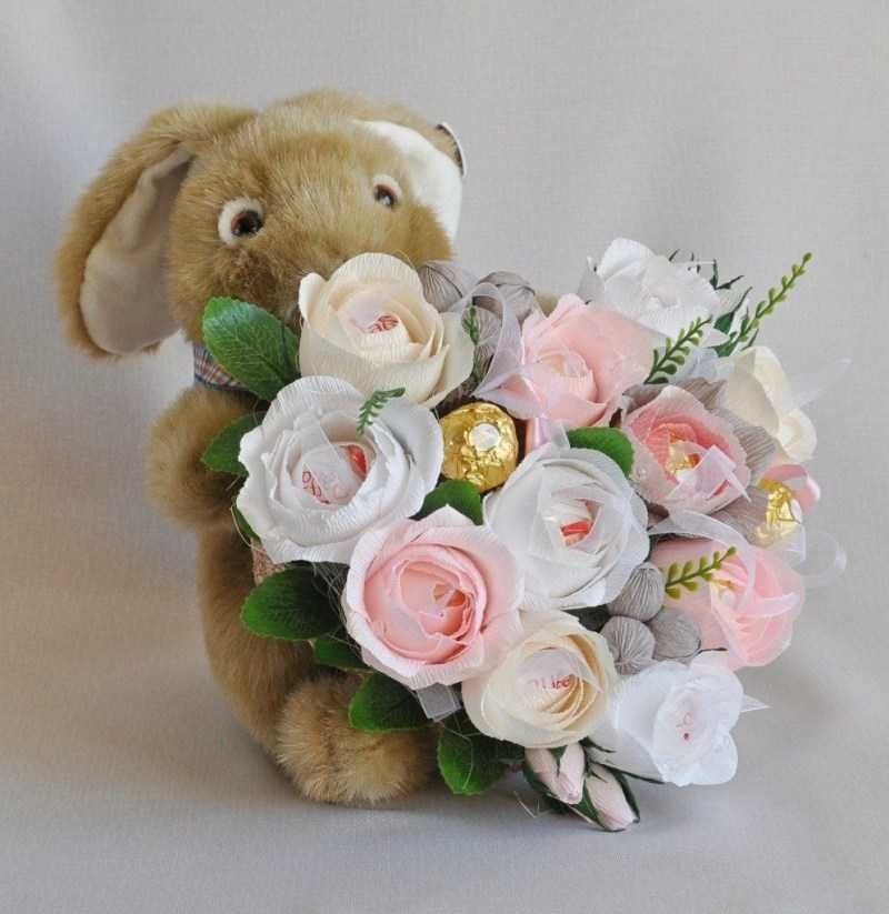 И тук бонбони, хартия, гъби, шишове, панделки и лъкове лесно се превръщат в букети, торти, сърца, животни или други предмети.
