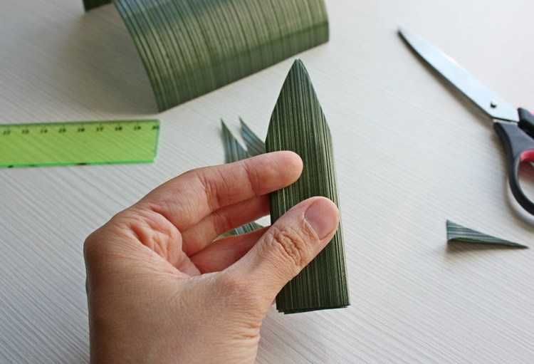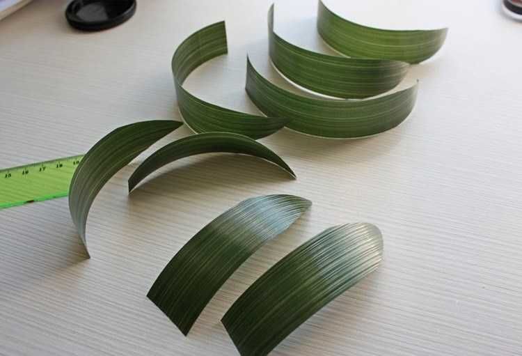 - 9×60 cm. 10 венчелистчета, широки съответно 6 см. Изпълнете познатата последователност, но усучете краищата от двете страни. Листата са с форма на триъгълник.