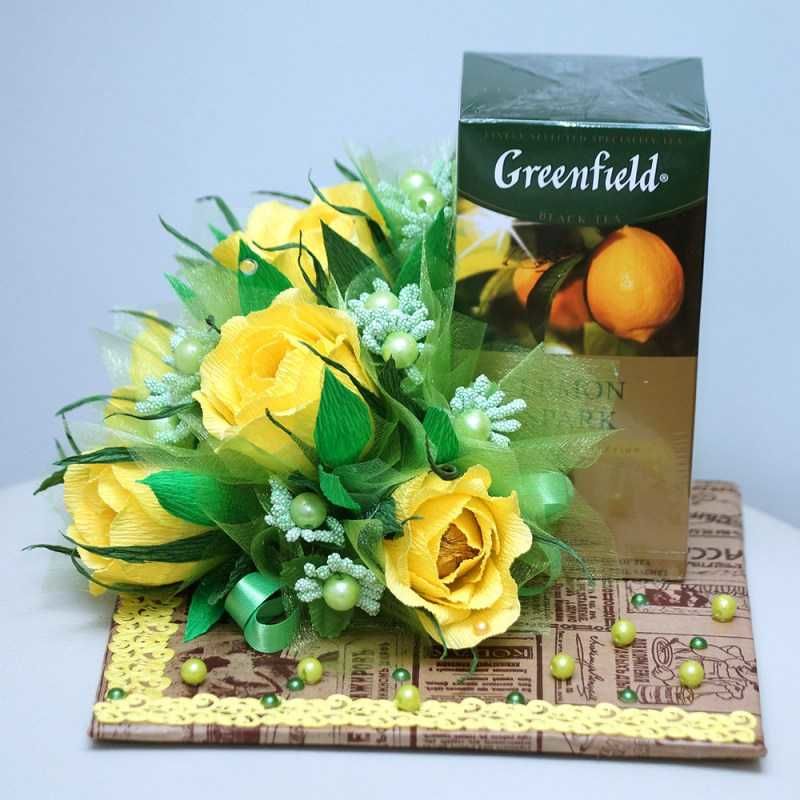 За любителите на ароматни напитки и сладкиши аранжировката на чай ще бъде идеален сувенир. При тази работа се използват буркани или торбички с чай и кафе. Комплектът може да бъде допълнен с бисквити, кексчета, буркан с мед и шедьовър на потника: