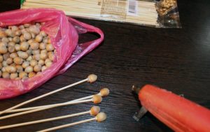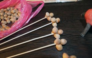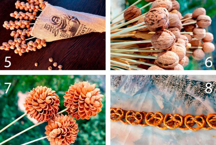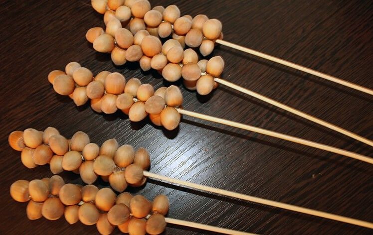 - С помощта на пистолет за лепило залепете лешниците на шишчетата, за да се получи желаният силует. Получените стръкчета могат да се оформят като малки букети.