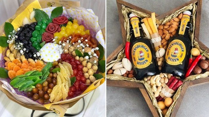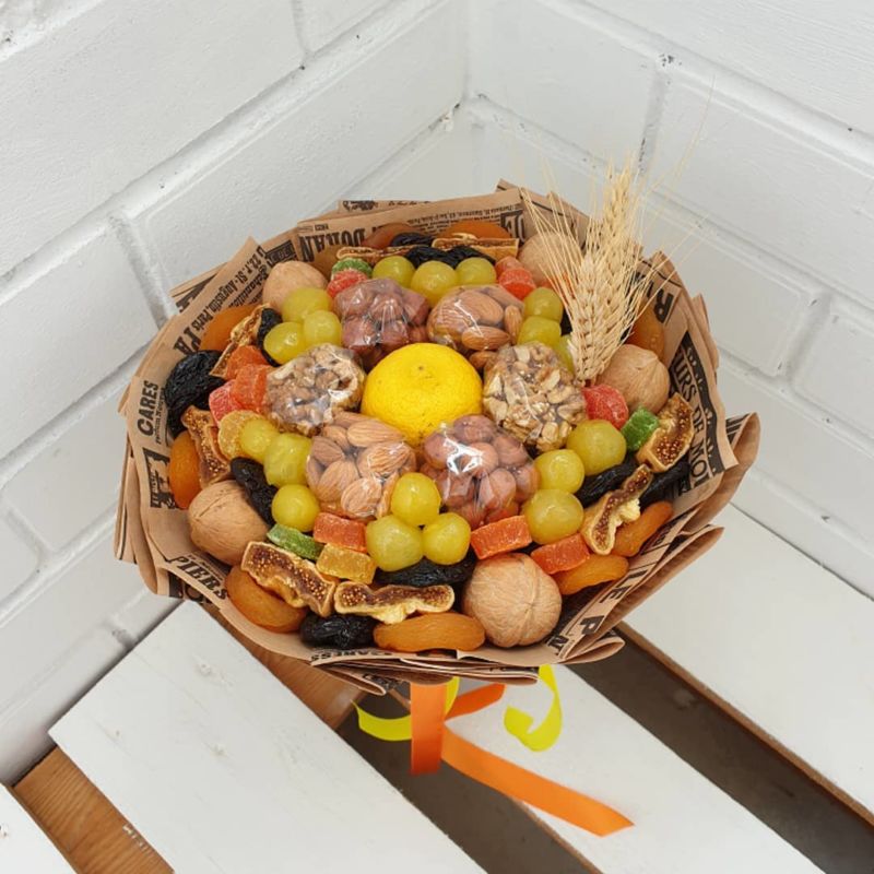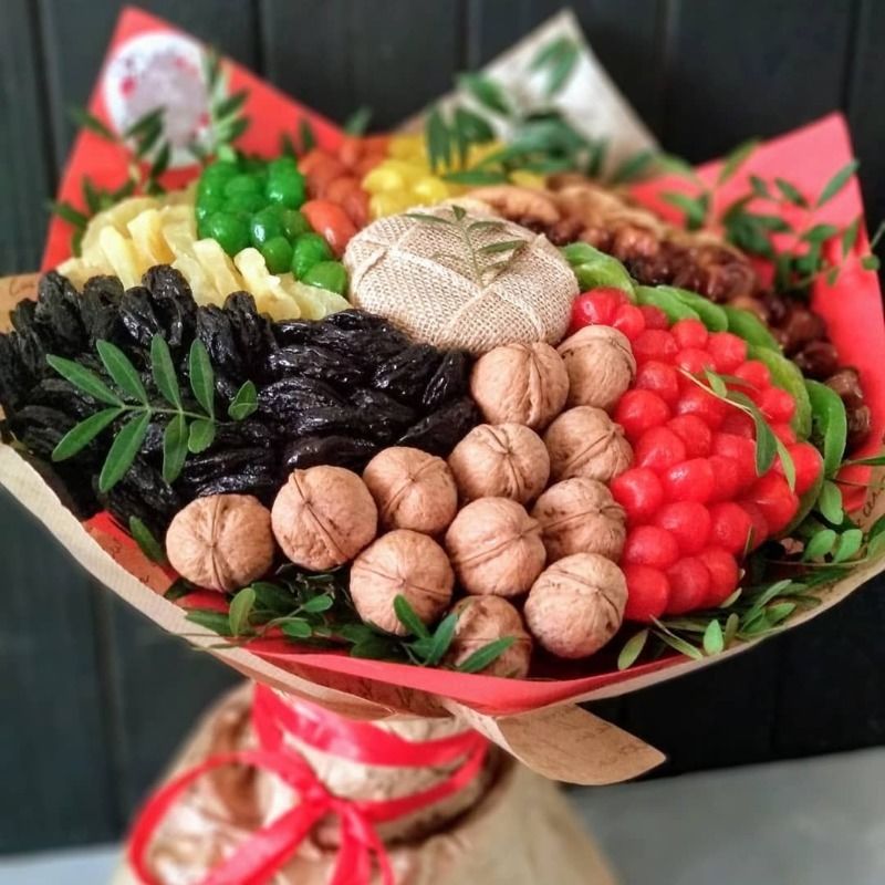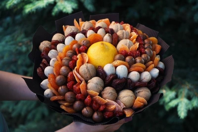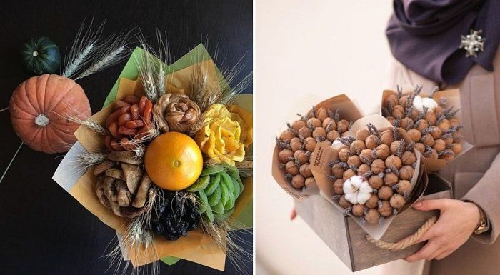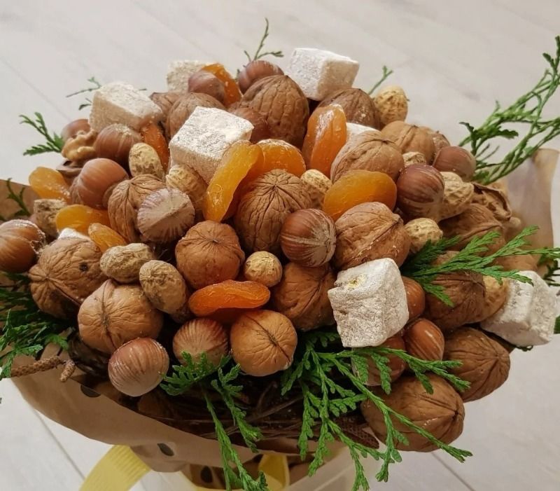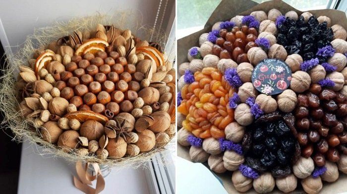 Подаръкът, украсен като букет от ядки, с добавка от плодове, сушени плодове и сладкиши, съчетава не само красота, но и полезност.