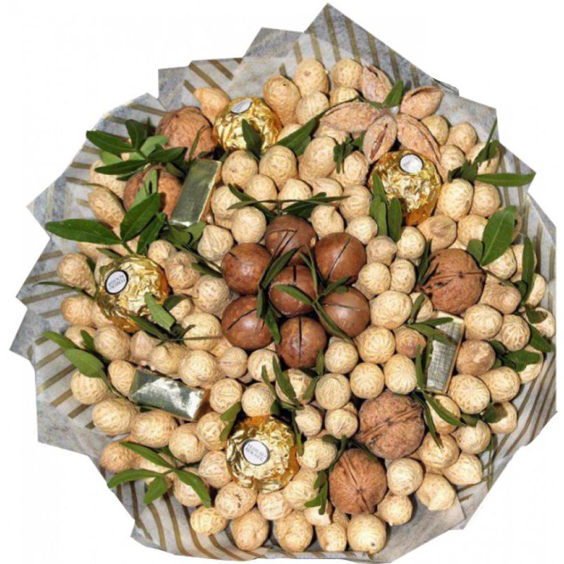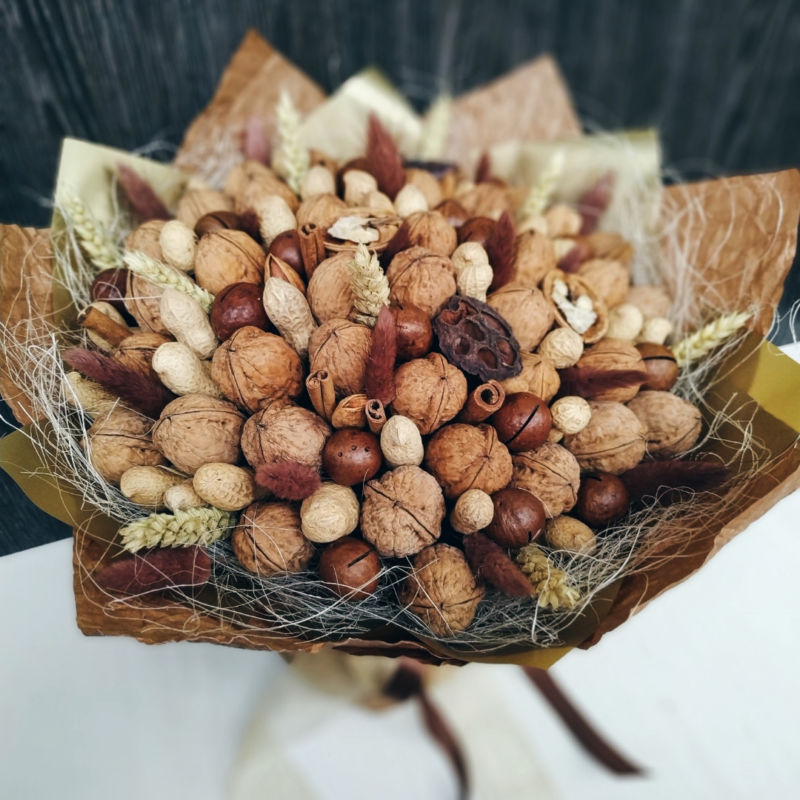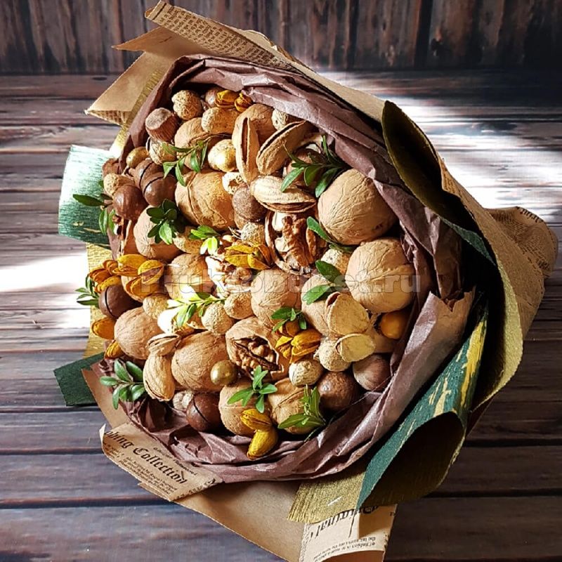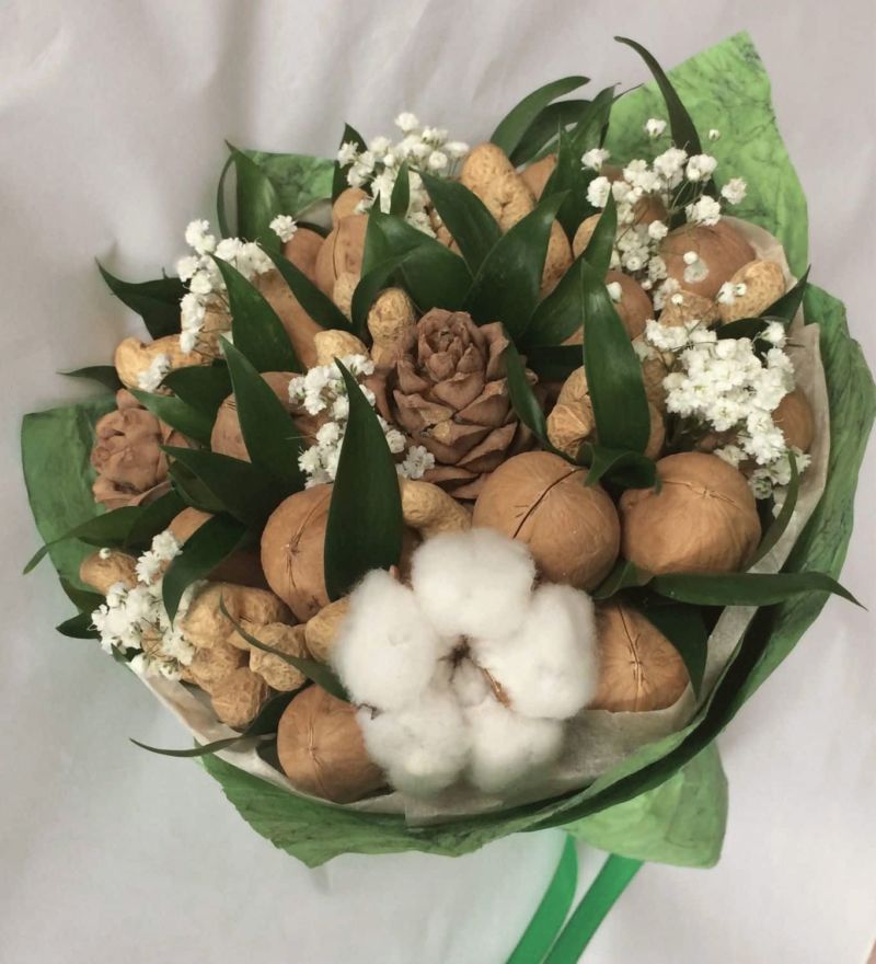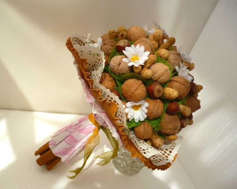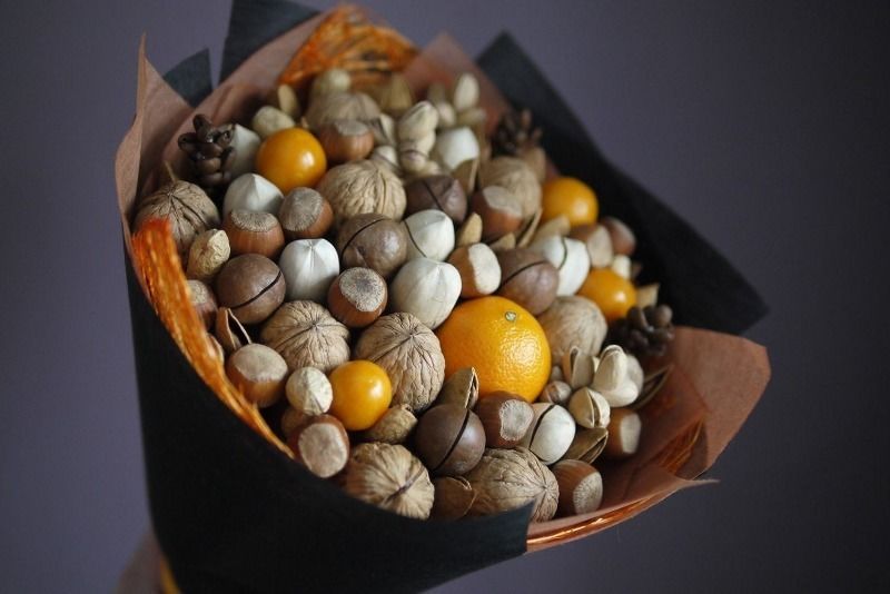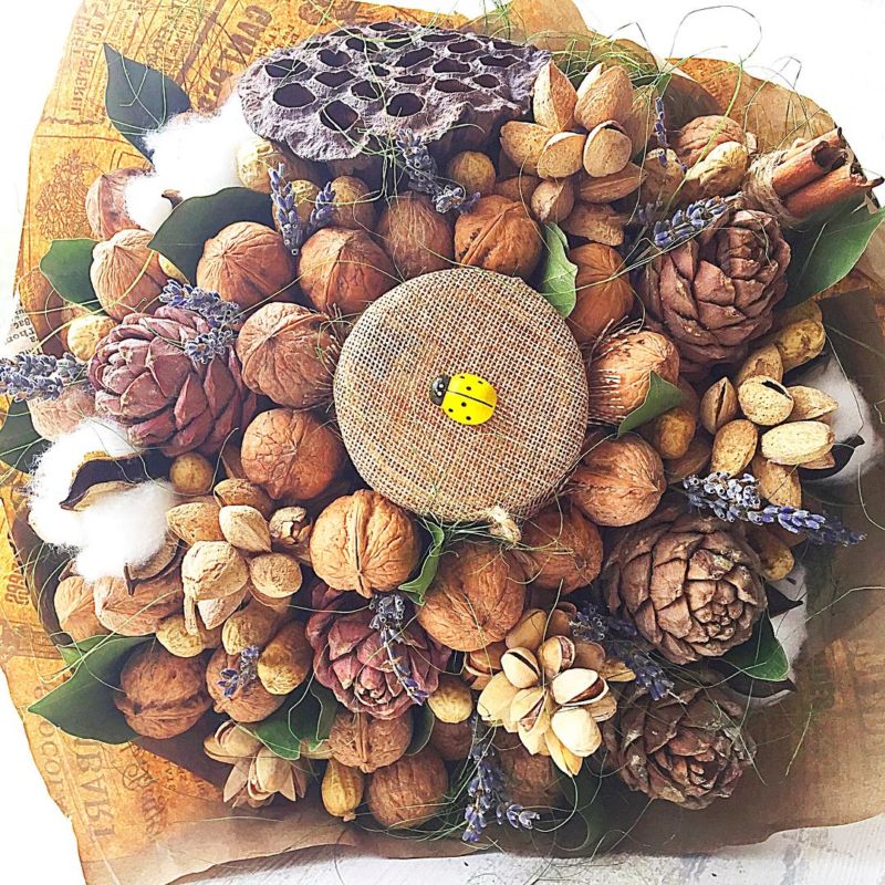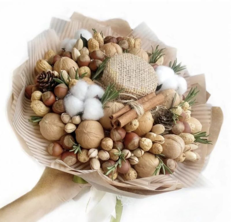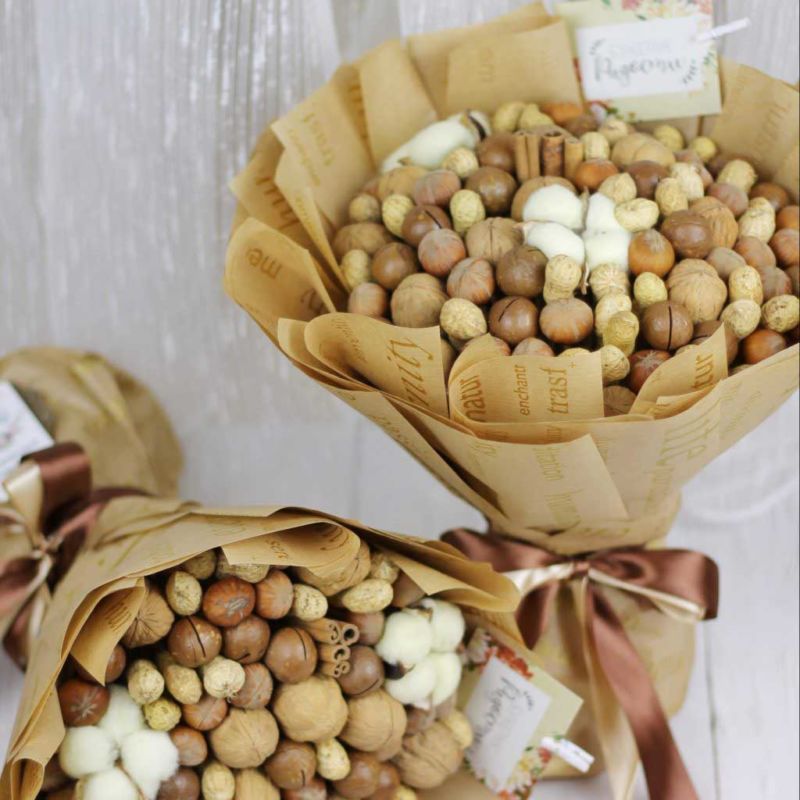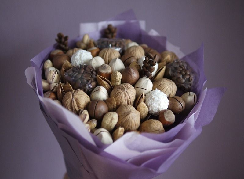Безспорното предимство на състава от ядки е ядливостта и трайността. Букетът може да се съхранява дълго време, принуждавайки собственика му периодично да мисли за подаряващия го.