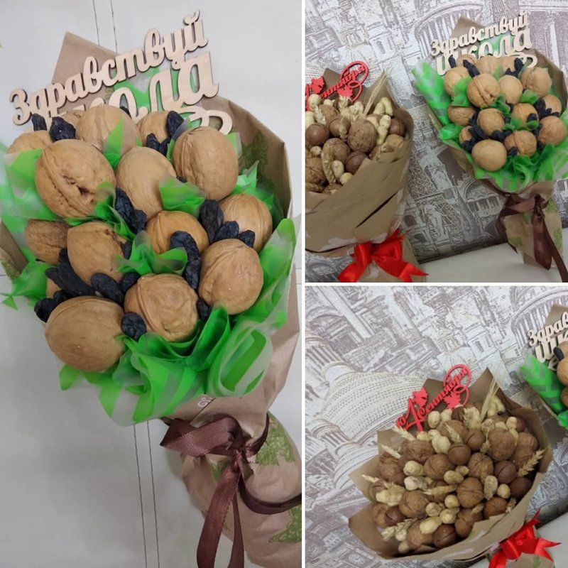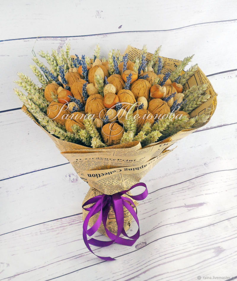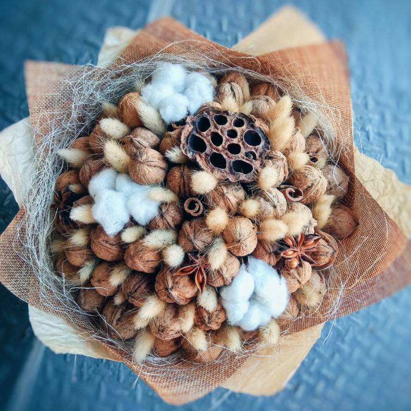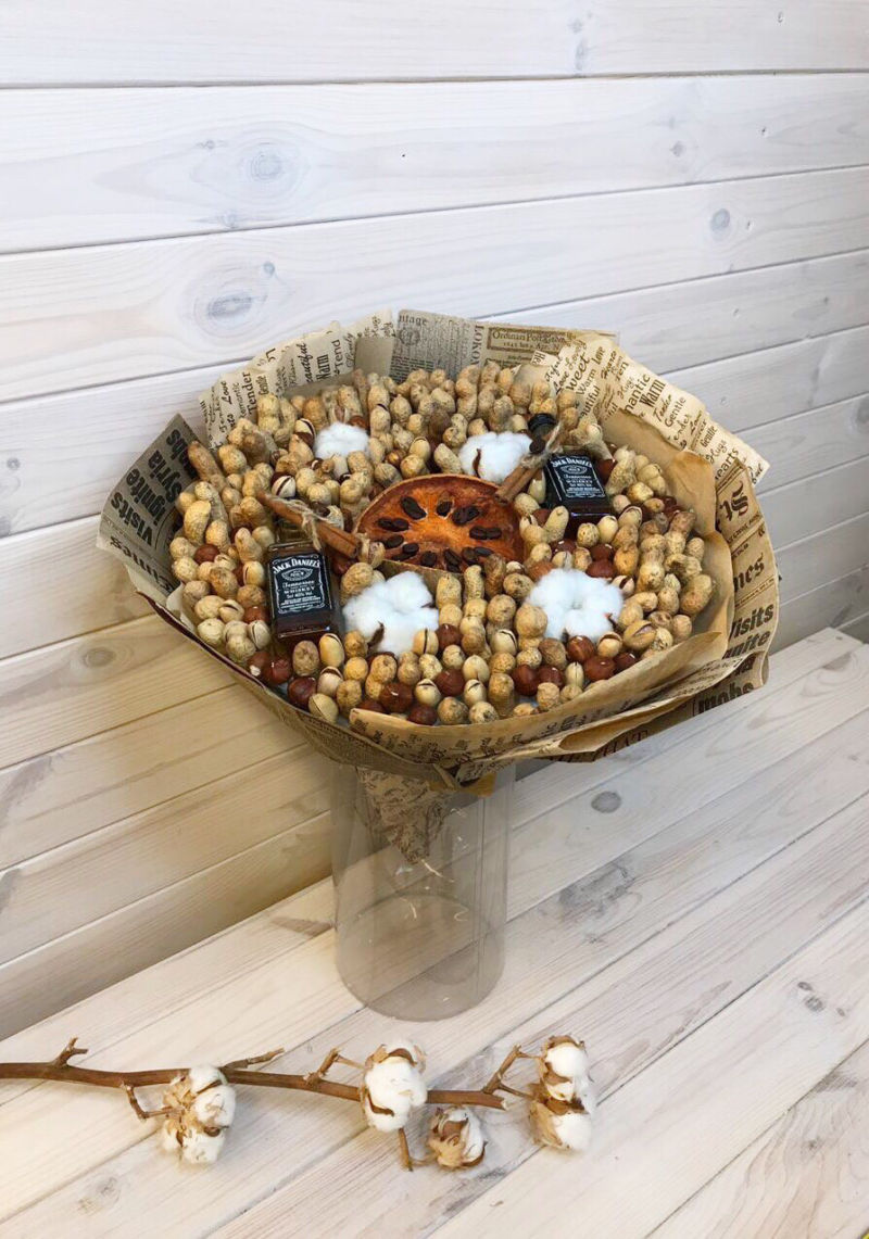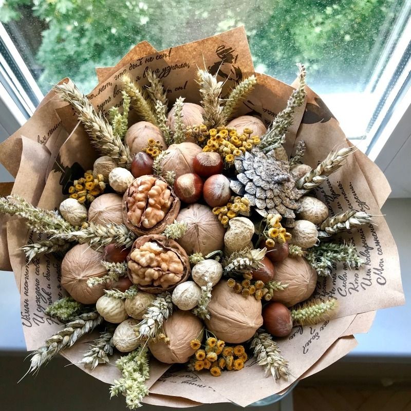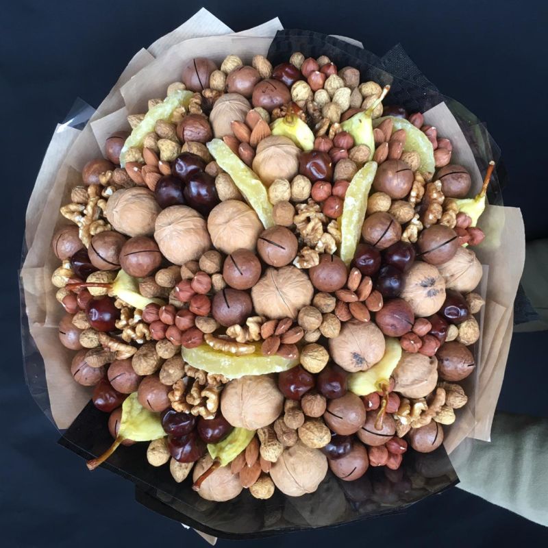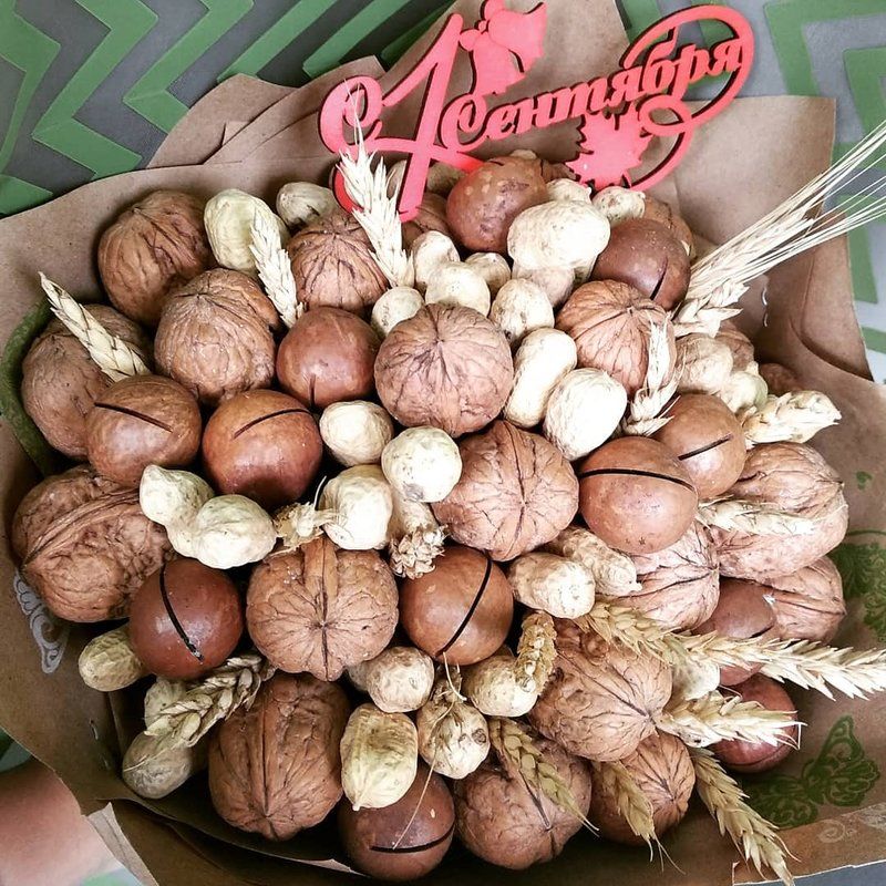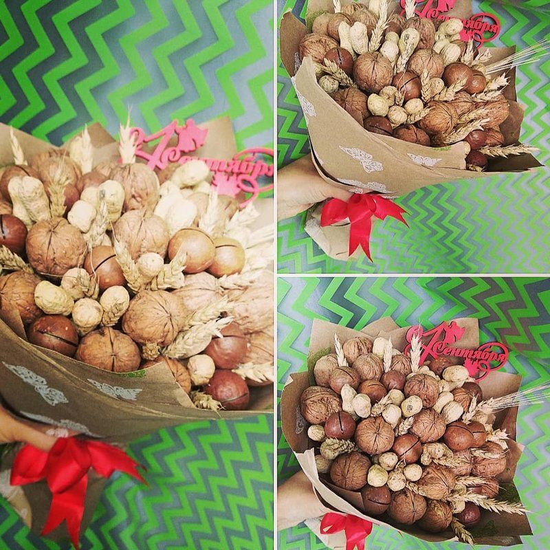 Безспорното предимство на състава от ядки е ядливостта и трайността. Букетът може да се съхранява дълго време, принуждавайки собственика му периодично да мисли за подаряващия го.