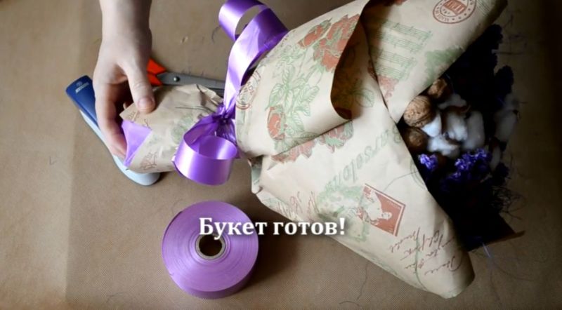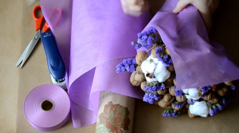 - Букетът трябва да бъде увит в крафт хартия в светлолилав или ярколилав нюанс. Филцът е подходящ и за опаковане.