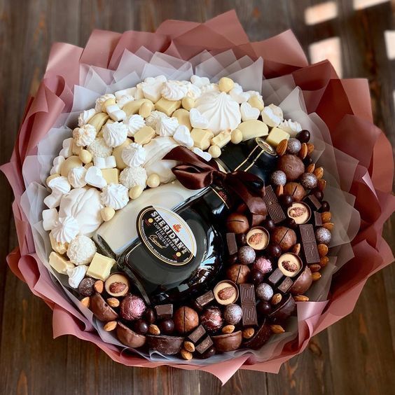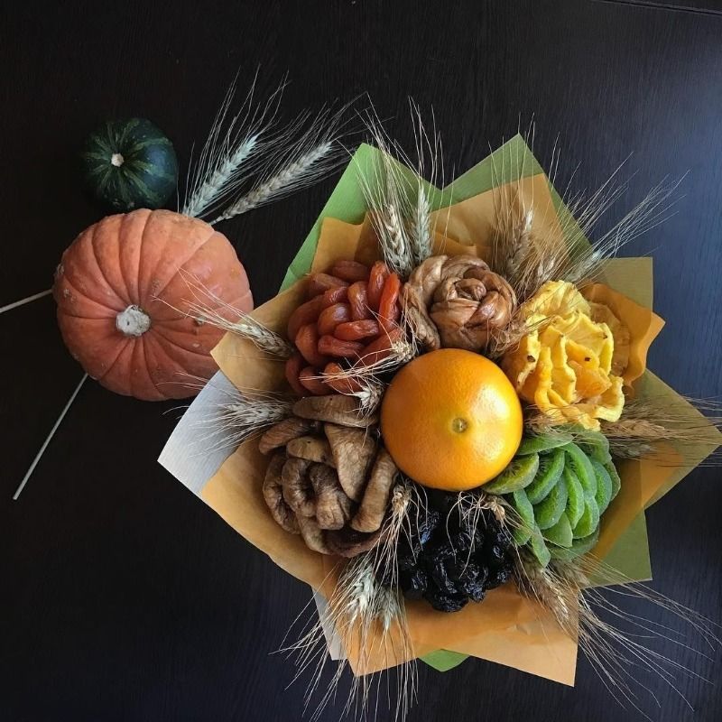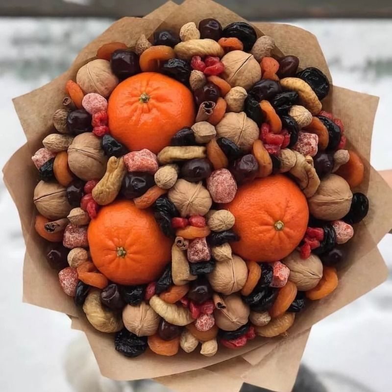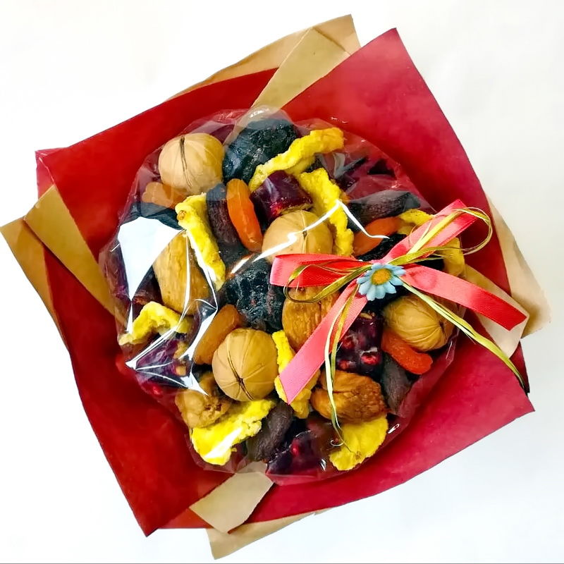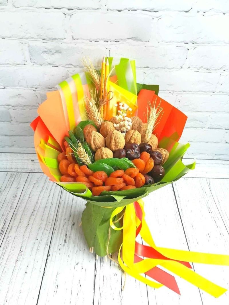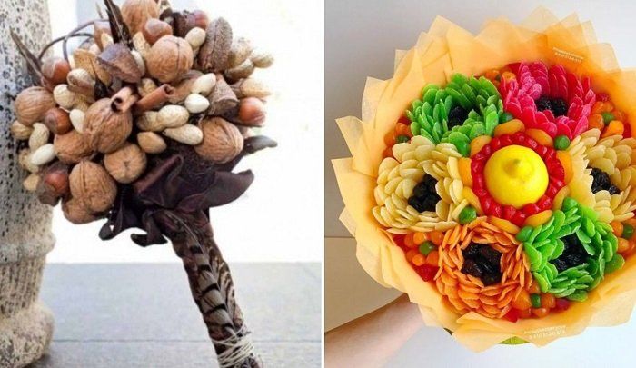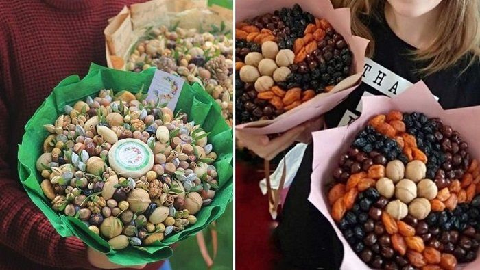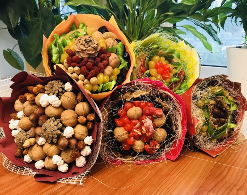 За всички, които обичат здравословната храна, а също и за креативните хора, сушените плодове и ядките са привлекателна аранжировка. В центъра на букета може да се постави бурканче с мед, чай или кафе. Всичко зависи от предпочитанията и въображението на получателя.