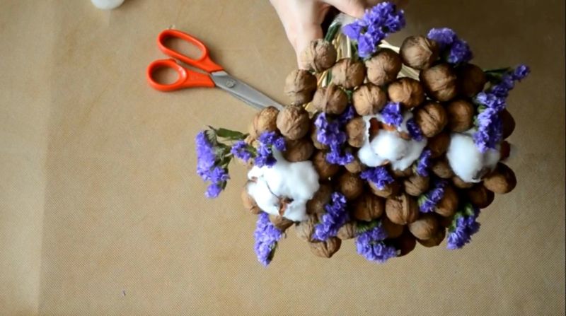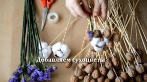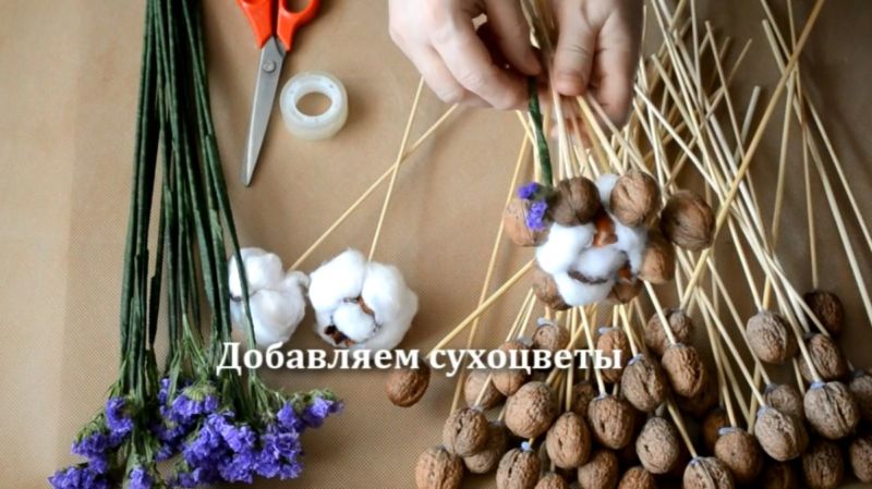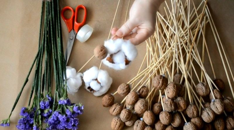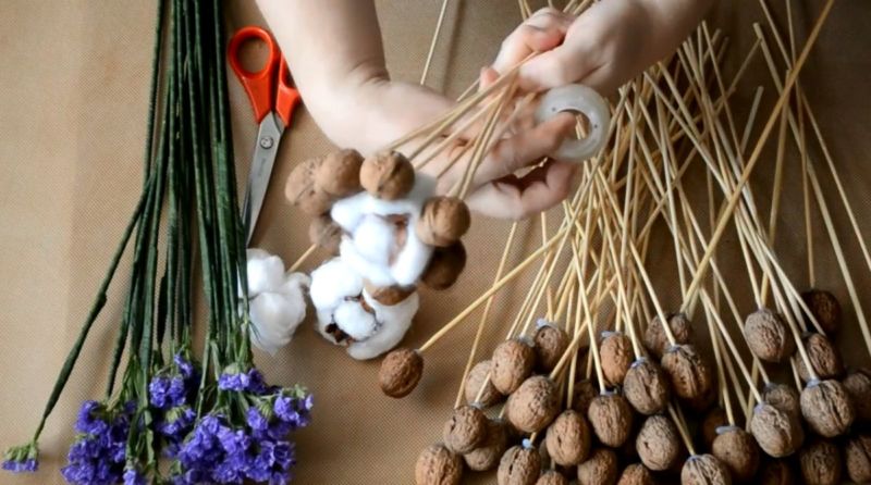 Букетът с орехи ще изглежда стилен и оригинален. Орехите се закрепват лесно на пръчки или шишчета. За да направите аранжировката, ще ви е необходимо: