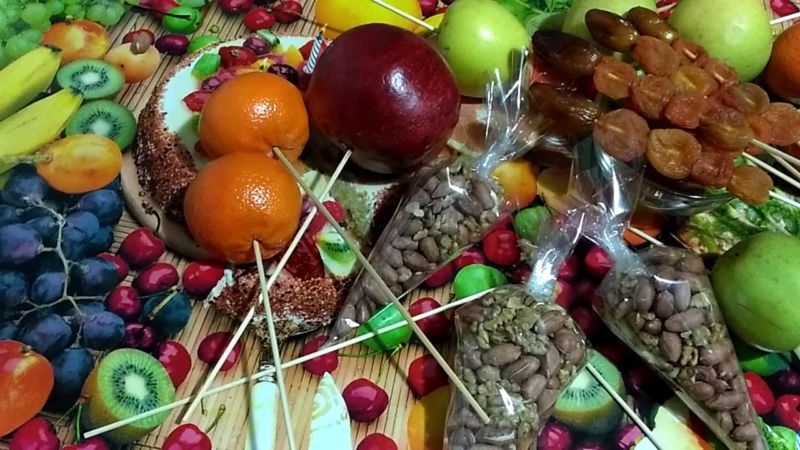 Ябълките и нарът са чудесни като пресни плодове. Всичко зависи от вкусовите предпочитания на получателя. Те трябва да се закрепят на шишове, както при предишните варианти. На шишчетата могат да се поставят всякакви ядки, като предпочитани са орехите, фъстъците или лешниците.