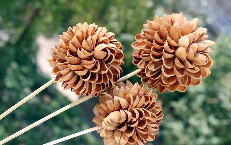 - Необходими са ви само черупките на шамфъстъка. Залепете половинките шамфъстък към шишчетата, така че да се оформят като надути гергини.