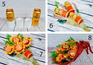 Преди да сглобите букета, трябва да решите как ще изглежда завършеното произведение. Препоръчително е да намерите подобен модел, преди да започнете. Всички компоненти трябва да се поставят на шишовете. След това можете да изберете един от вариантите за сглобяване на букета: