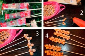 - Вторият вариант. Дървени шишчета със сушени плодове и ядки се поставят в чиния от стиропор или гъба.