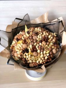 Съществуват много възможности за създаване на букети от смес от ядки. Най-разпространеният вариант е всички ядки да се нанижат на шишове и да се скрепят с телчета: