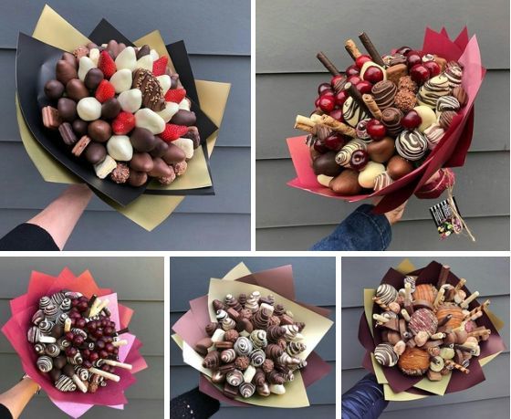 Цялото това изобилие може да бъде обзаведено с ярка зеленина, увита в прозрачна или матирана хартия и украсена с панделки, панделки и декоративни елементи. Кутиите за шапки се използват за създаване на специално настроение.