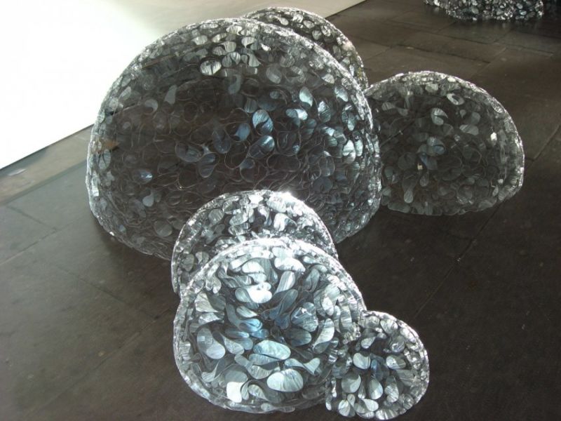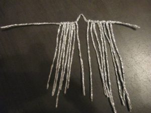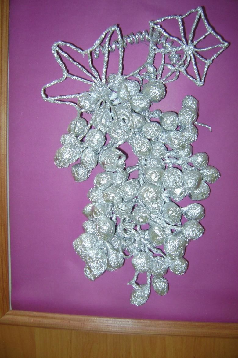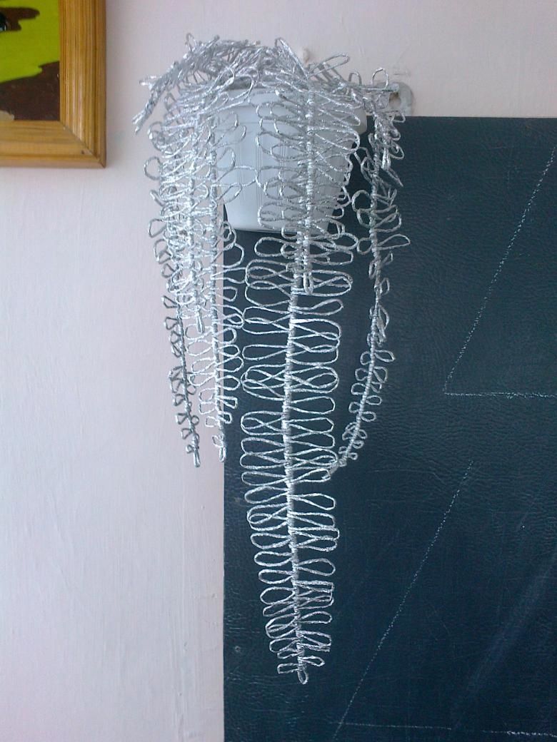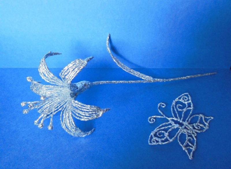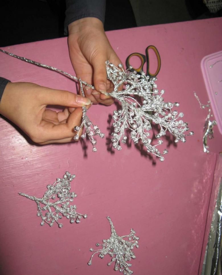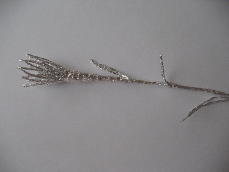 Изделието е изработено от метализирани клонки - ивичестите листенца напомнят на мънистени сувенири. Процесът на изработване на мънистата е достъпен дори за начинаещи: