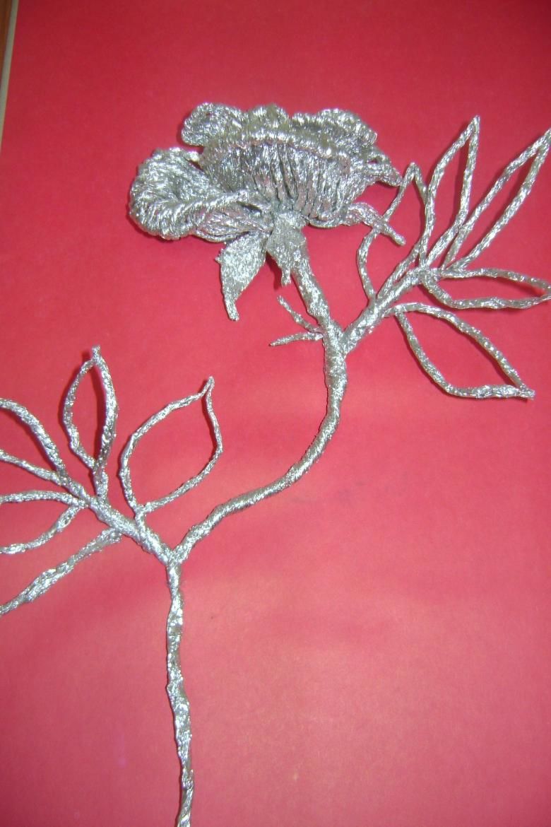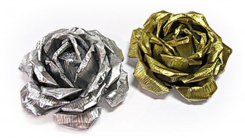 След като усвоите стъпка по стъпка плетенето на цветя от лилиум във фолио, можете да започнете да правите метални рози. Разликата е, че те имат много повече венчелистчета от другите цветя, които трябва да се свият в пъпка.