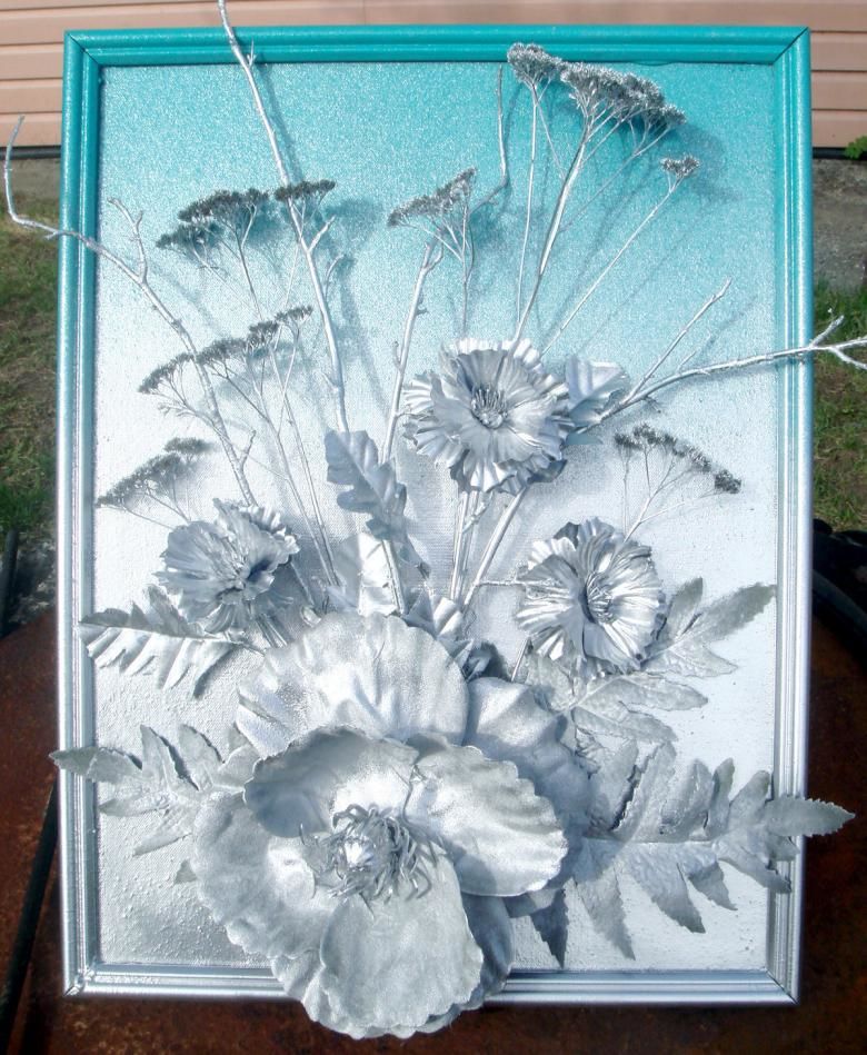 Полезен съвет! За по-декоративен ефект цветната композиция може да се допълни с гирлянди, метални или перлени мъниста (половинки от рози) и сухи растения. Те са плътно покрити със сребърен или златен спрей. Капките втвърдено лепило могат да наподобяват роса върху цветовете.