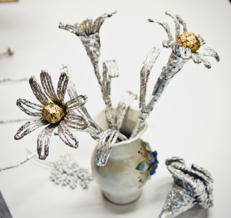 Полезен съвет: Ако откриете цветни листове в обвивката за сладкиши, трябва да ги оставите настрана и да ги запазите за изработка. Когато имате време, използвайте го за творчески процес - изработване на ефектни сувенири или изкуствени цветя от фолио стъпка по стъпка.