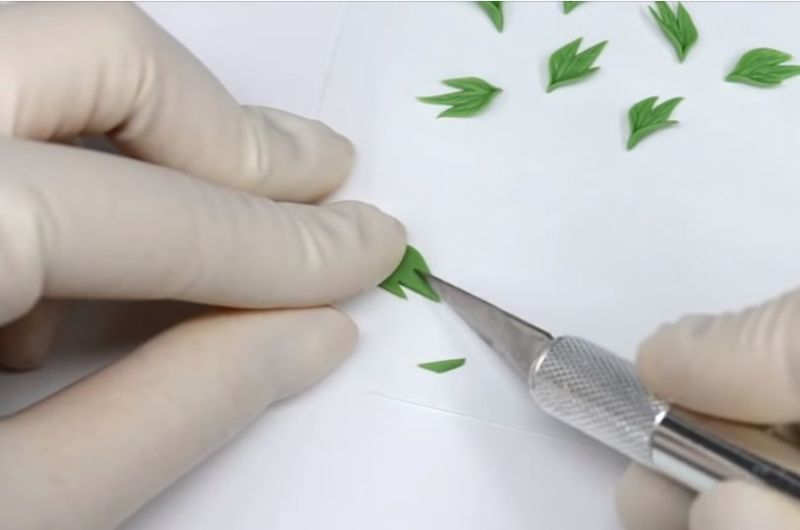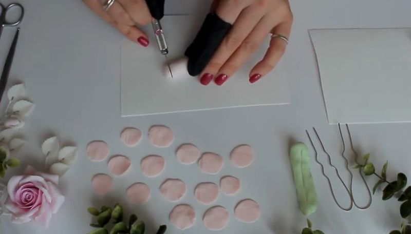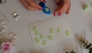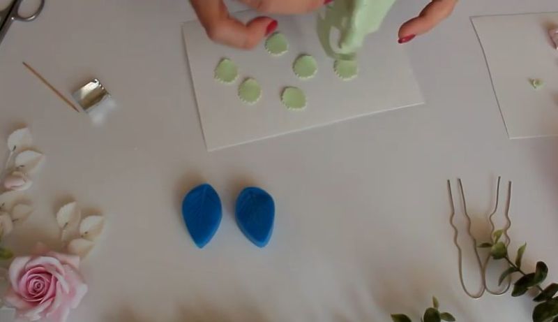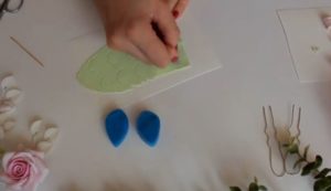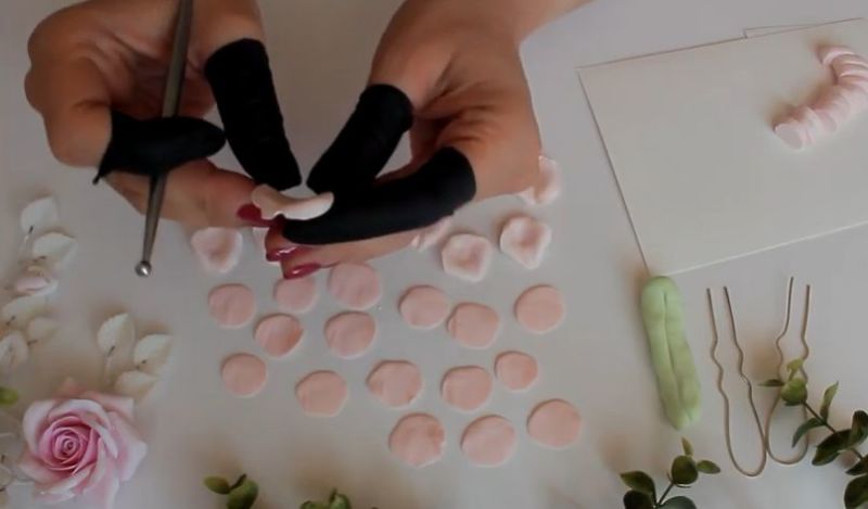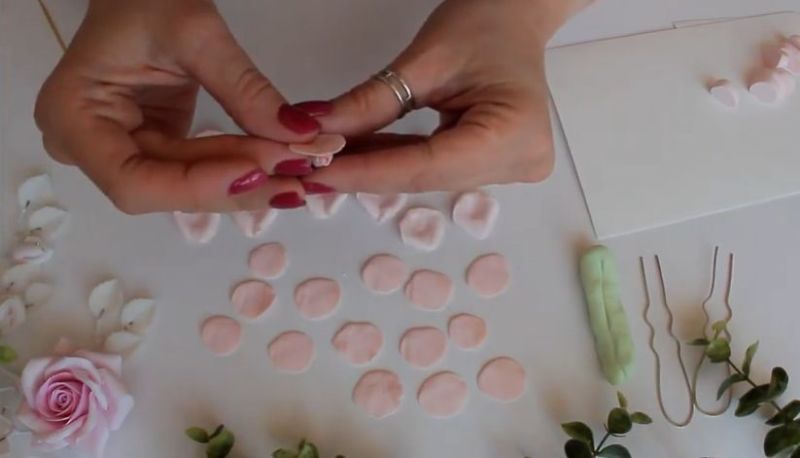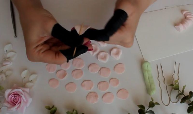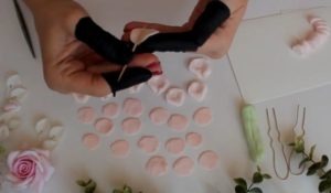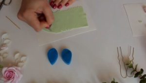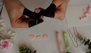 След това трябва да разточите глината с помощта на точилка и да изрежете три венчелистчета. Можете да им придадете окончателна форма, като омесите и разтегнете плочата с пръсти.