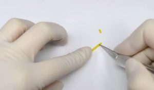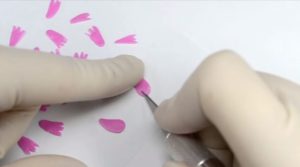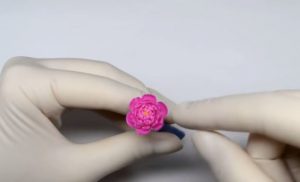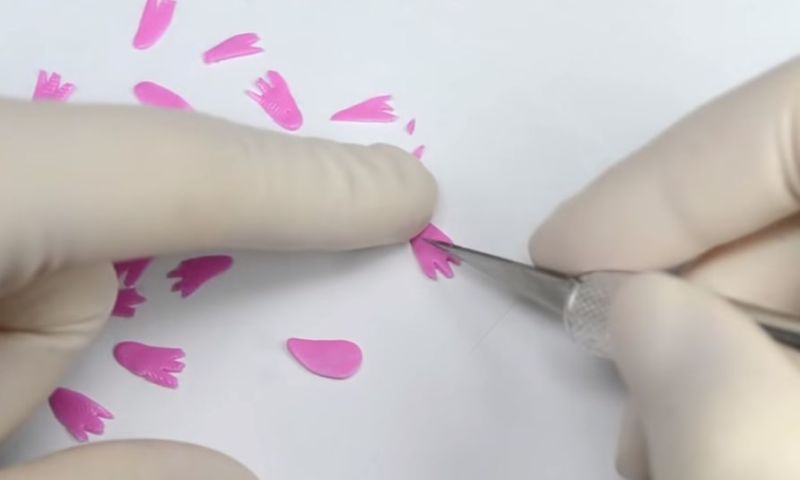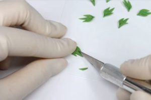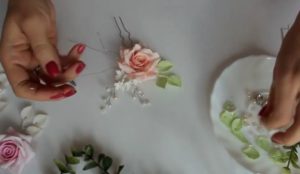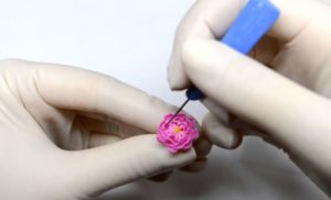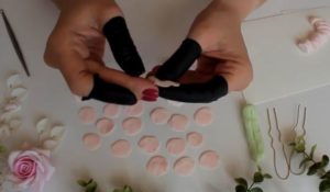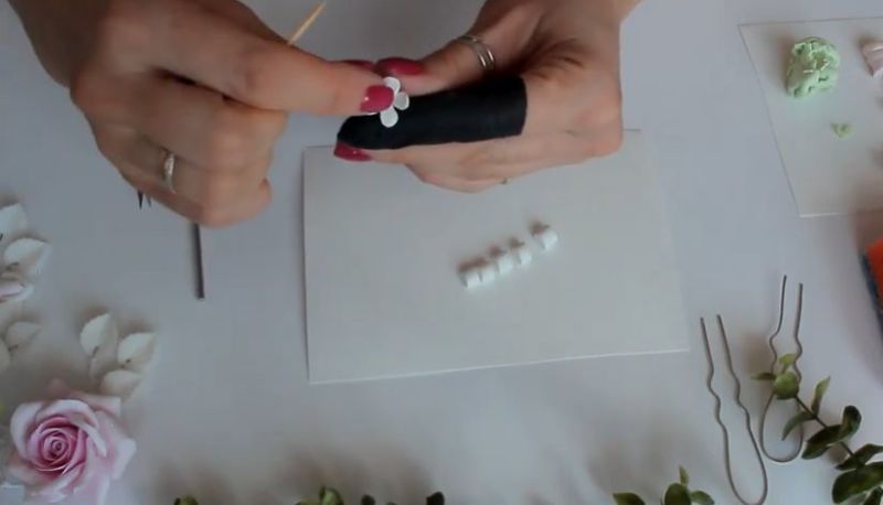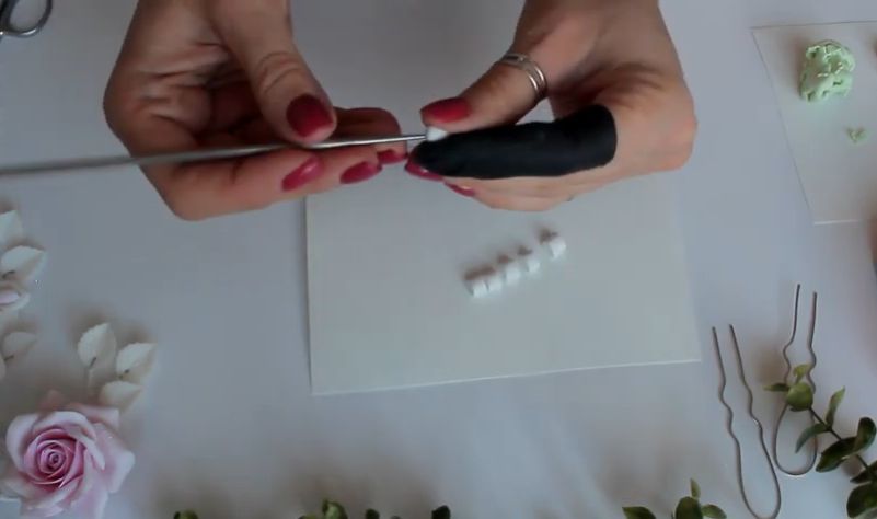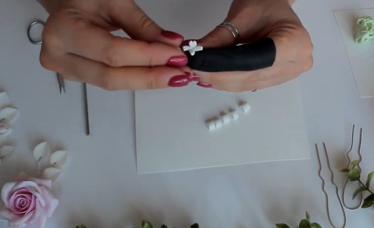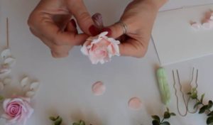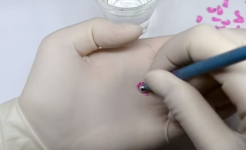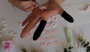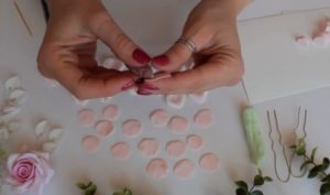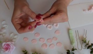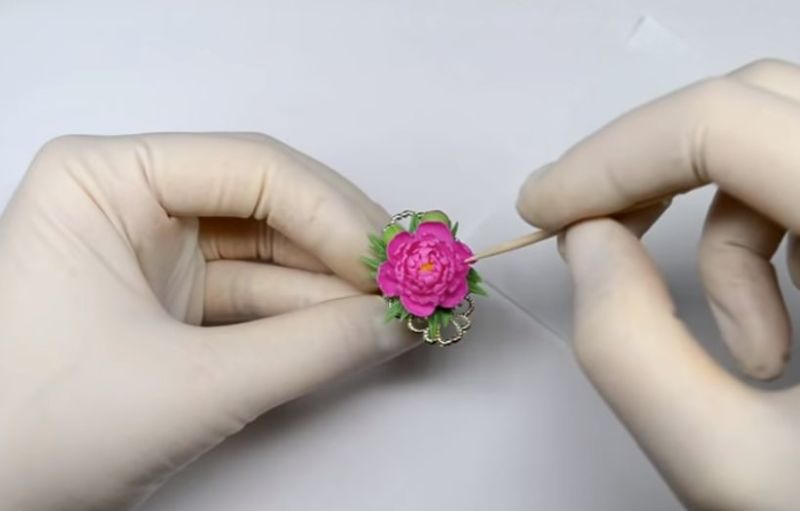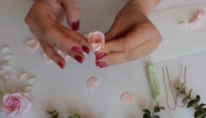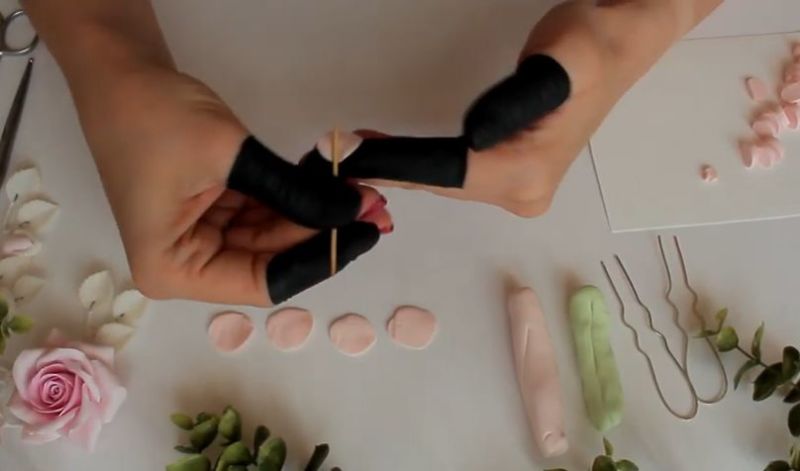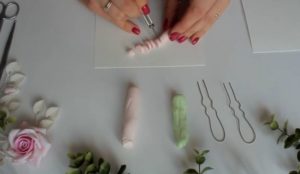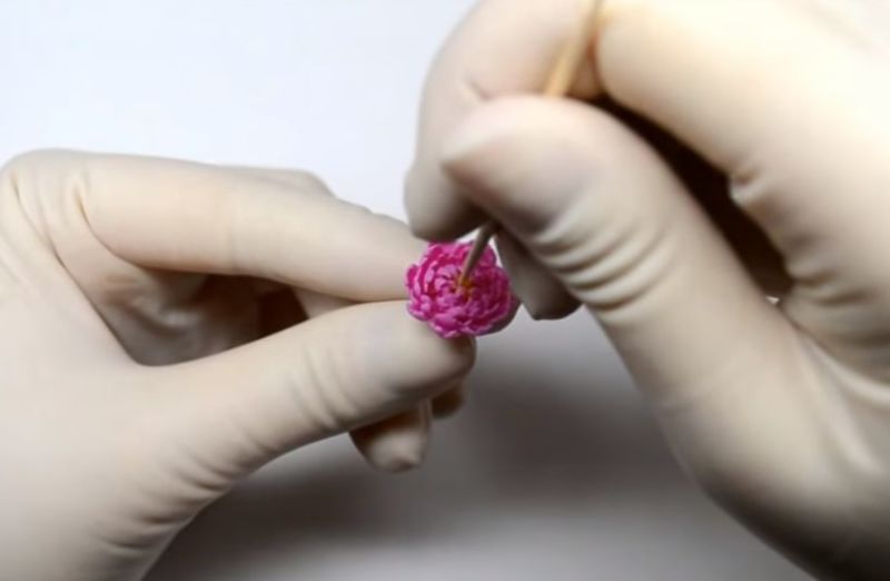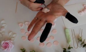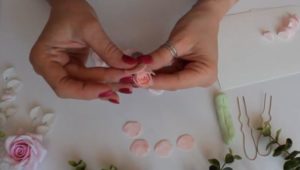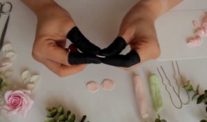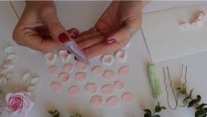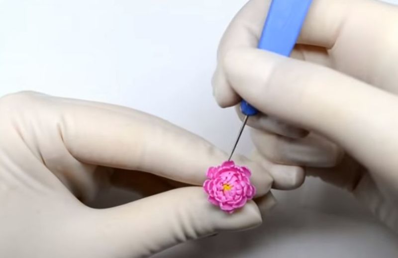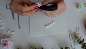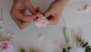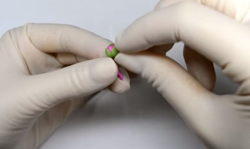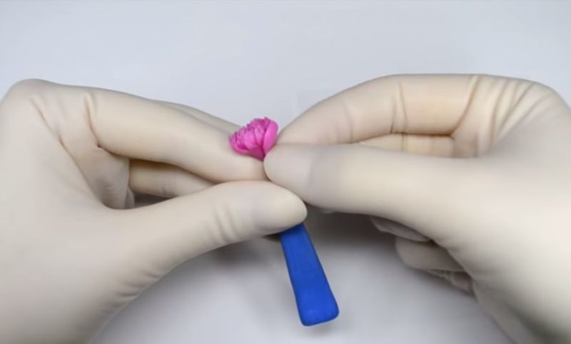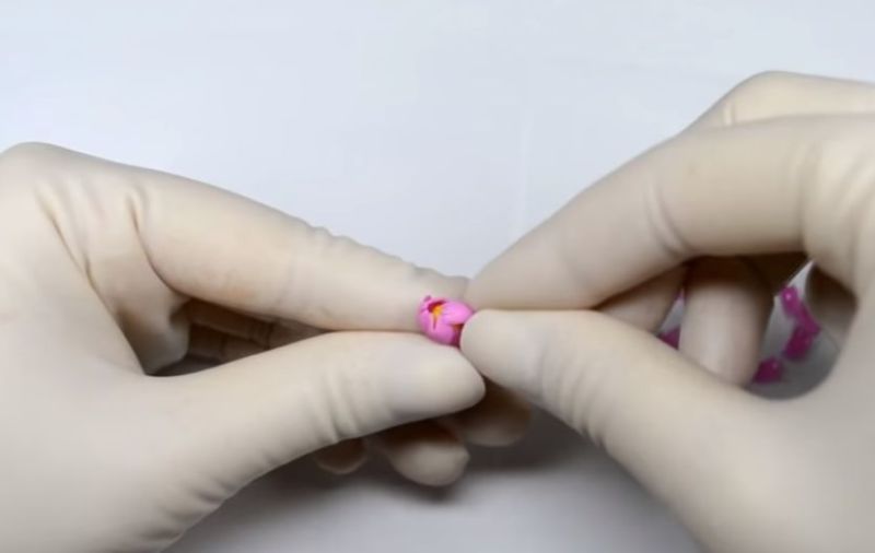 Когато пъпката е готова, притиснете венчелистчетата в основата с пинсета. Краищата са отрязани. Втората топка е изваяна от основата на пъпката.