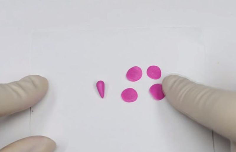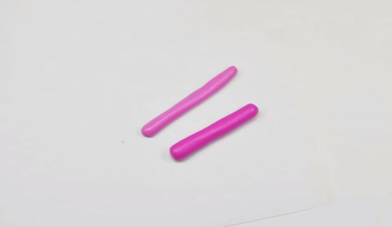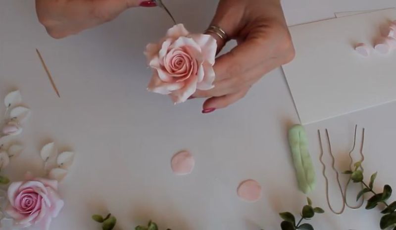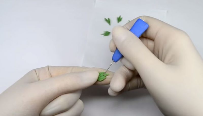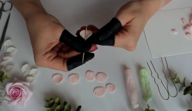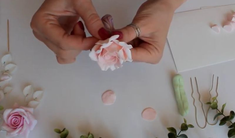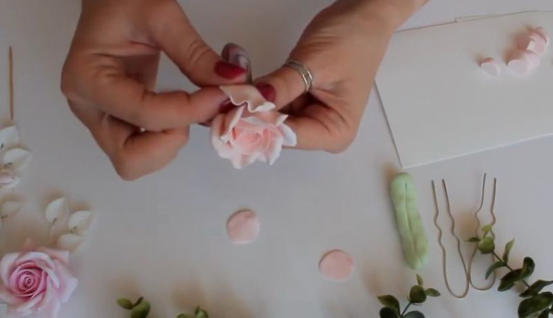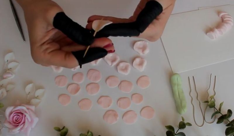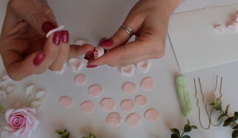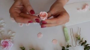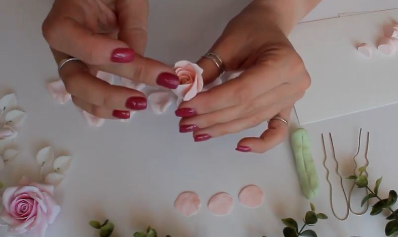 За да направите роза, трябва да поставите две малки топчета от полимерна глина в единия край на стъблото. Направете няколко овални листенца с леко неправилна форма и най-малкото триъгълно листенце.