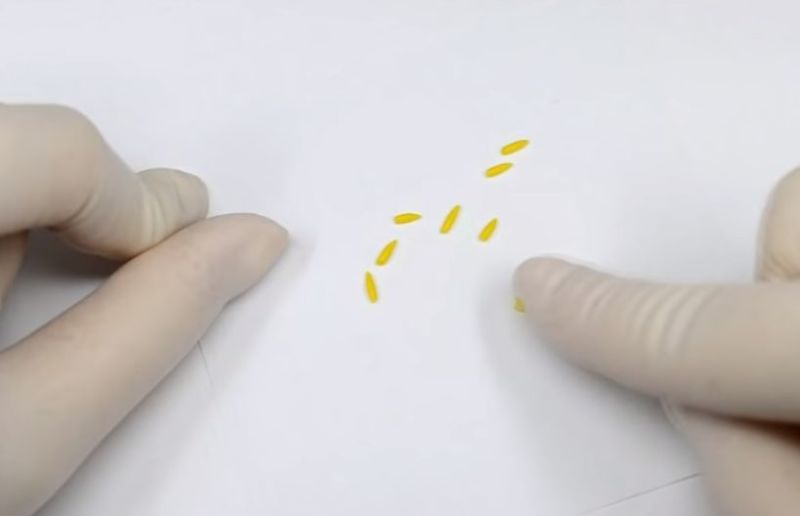Върху единия край трябва да се постави слой от 1,5-2 мм полимерна глина. Използвайте четка за боядисване, за да размажете точки по цялата площ. Това ще бъде тичинката на цветето.