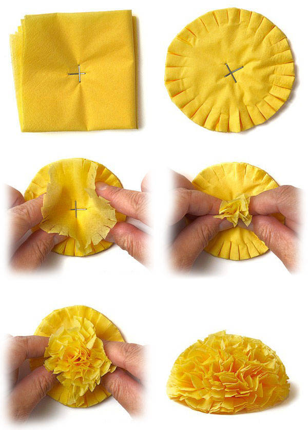 Жълтото глухарче, създадено със собствените ви ръце, със сигурност ще повдигне настроението ви и ще носи късмет през целия ден! Ще ви трябват доста дебели трипластови салфетки, телбод и ножица.