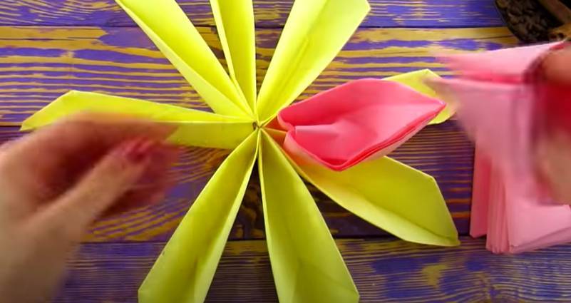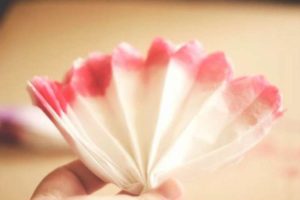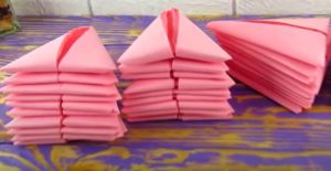 - Розовата, червената и бялата салфетка се сгъва на хармоника и се завързва в средата.