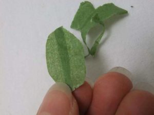 - Две парчета от къса зелена панделка се съединяват, за да се получи лист, след което се изрязват с остра ножица.
