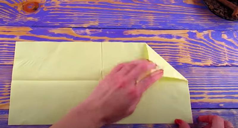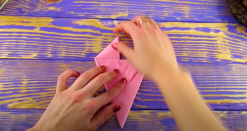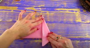 - Подготвената салфетка се сгъва няколко пъти наполовина. Резултатът е обемен, подпухнал кръг, който трябва да бъде внимателно коригиран и изправен.