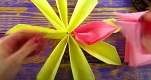 - Две парчета шенилна тел са прикрепени към парчето от двете му страни, салфетките са усукани, в резултат на което се получава многоцветна комбинация от салфетки.