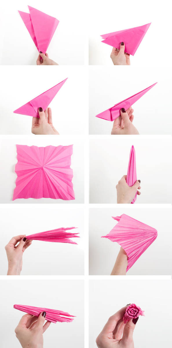 За начинаещите в тази област е най-лесно да започнат с изработването на прости цветя с лесна техника. Необходими са ви 12 салфетки с размери 50 на 65 см. Можете също така да използвате цветни сатенени панделки, за да украсите готовия продукт.